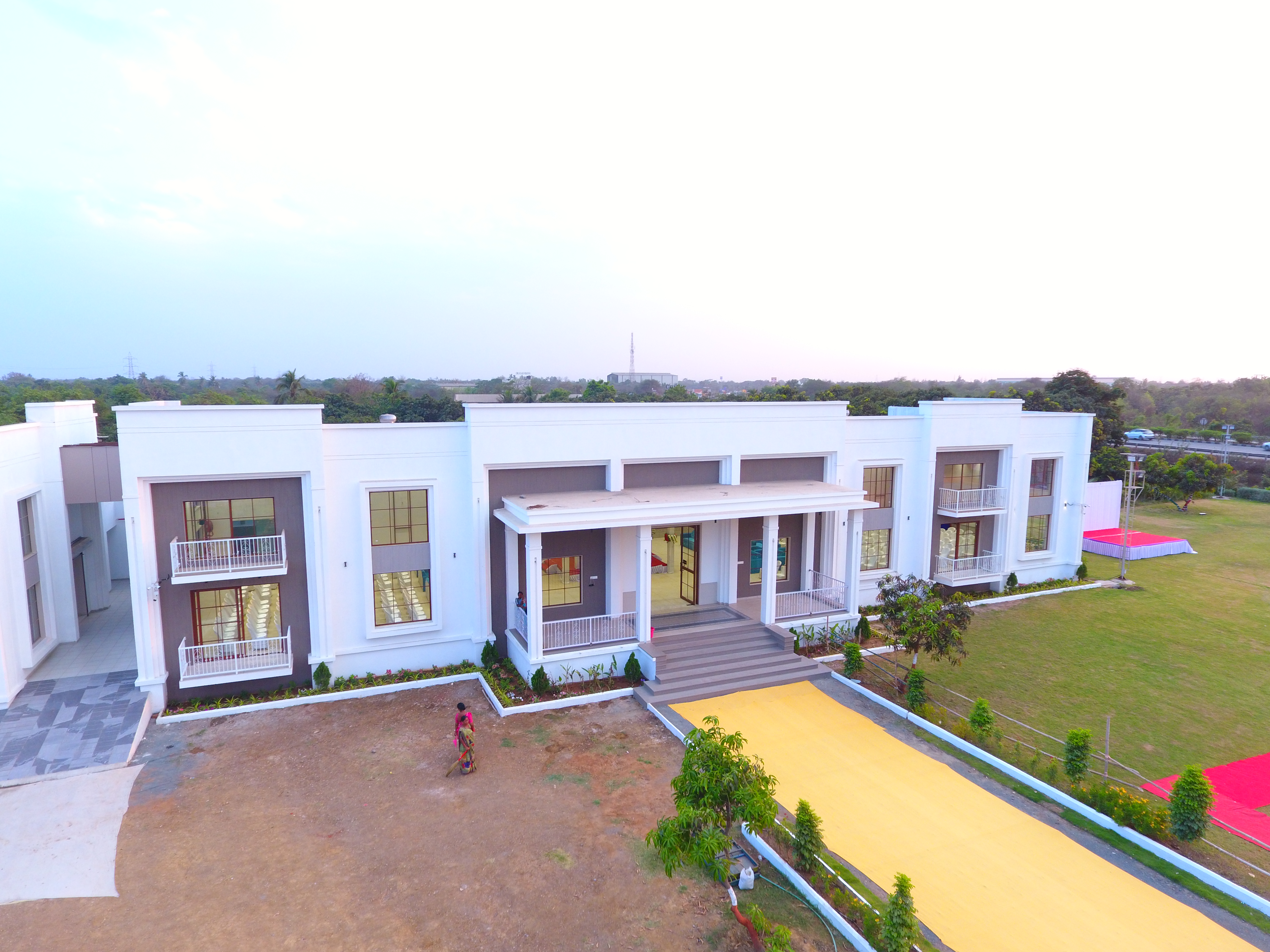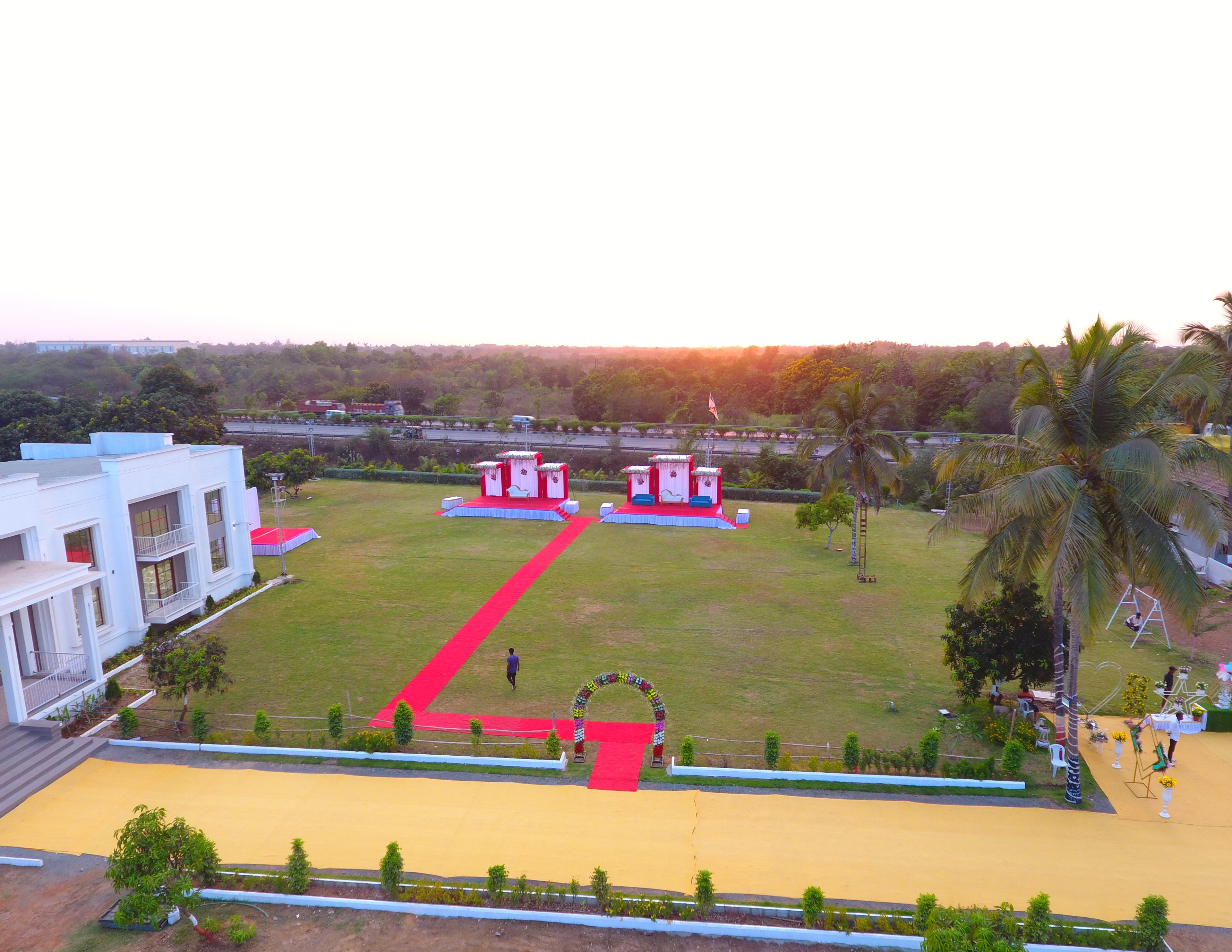 A stunning aerial view highlighting the full property layout, including halls, lawn, and parking areas.